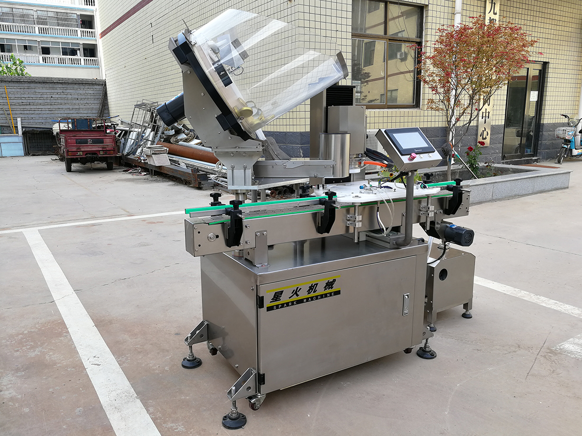 是玻璃瓶馬口鐵瓶旋緊瓶蓋的專用自動化真空旋蓋設備,該醬料玻璃瓶真空旋蓋機包括:進出罐輸送、進罐器、配蓋器、真空室、旋蓋頭等主要部件,設備采用304不銹鋼制作,外形美觀,結構考究,PLC電子光纖傳感控制,實現自動進出罐、自動配蓋、抽真空、夾緊瓶身、旋蓋等動作,多應用在醬料瓶、罐頭及保健食品行業,采用氣動和電氣編程控制取代機械傳動裝置帶來的好處是:設備可以很干凈,避免潤滑油脂對生產環境和產品的影響,很重要的是,可以對產品需達到的指標參數進行監控和靈活調整,如真空度、擰蓋力矩等。氣動裝置,運行靈活方便,大大提升了企業的工作效率。